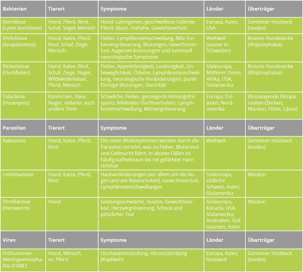 Unter Vektoren-übertragenen Erkrankungen versteht man Krankheiten, die durch Bakterien, Parasiten und Viren ausgelöst werden. Diese wiederum werden übertragen – bei Mensch und Tier – durch blutsaugende Vektoren (Überträger) wie Zecken, Mücken, Fliegenarten usw. Von Zecken übertragen werden die Krankheiten Borreliose, Babesiose, Frühsommer-Meningoencephalitis (FSME, Hirnhautentzündung), Ehrlichiose, Tularämie und Rickettsiose. Leishmaniose und Dirofilariose werden von Mücken übertragen.